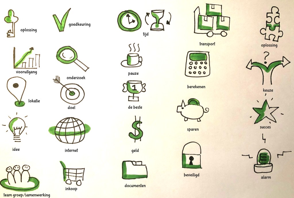Het is echt niet nodig dure spullen aan te schaffen. Dat legt de drempel om te presteren alleen maar hoger. Wil je (thuis) oefenen, ga dan aan de slag met je agenda en vervang een aantal woorden door tekeningen.